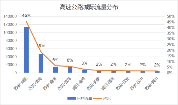 预计2026年春节假期高速公路省内城际间通行流量主要分布在西安与周边地市之间,其中排名前三的为:西安-咸阳、西安-渭南、西安-商洛。预测占比分布如下: